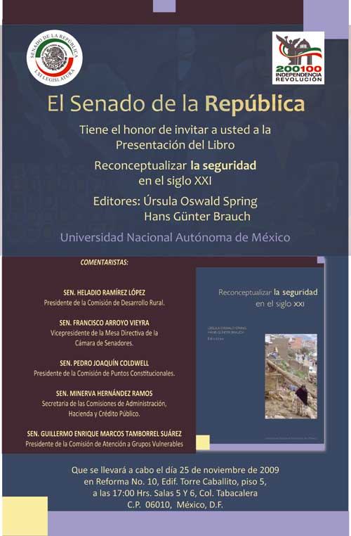 Ante la necesidad de garantizar a la población una vida sin amenazas ni violencia y con la posibilidad de un mejor futuro, es insoslayable reconceptualizar la seguridad humana, aseguraron los investigadores Úrsula Oswald Spring y Hans Günter Brauch, autores del libro. |